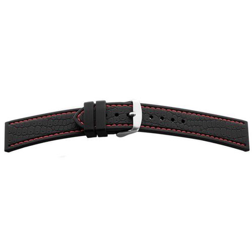 Silikonový řemínek BEAR černé barvy s "kroko" vzorem a s červeným prošitím, se stříbrnou sponou. Řemínek je u pouzdra široký 18 mm a ke sponě se zužuje na 16 mm. Délka řemínku: 120 / 80 mm Tloušťka: 3,5 mm