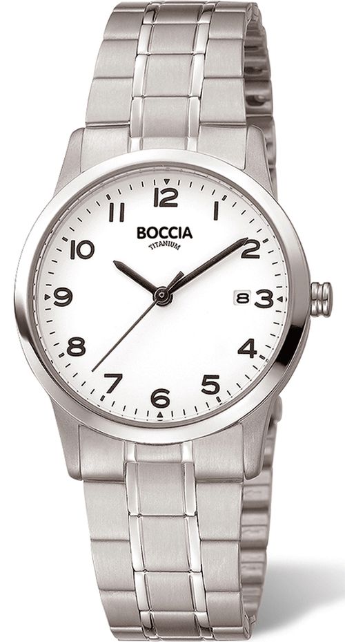 Značka: BOCCIA TITANIUM | Model: 3302-01 | Barva: stříbrná | Barva pouzdra: stříbrná | Materiál pouzdra: titan | Napájení: baterie | Materiál řemínku: titan | Funkce: Datum - den v měsíci | Průměr: 29 mm | Tloušťka: 7 mm | Vodotěsnost: 50M/5ATM | Sklo: minerální | Tvar: kulaté | Typ zapínání: překlápěcí přezka | Číslice na ciferníku: arabské | Určení: dámské | Typ produktu: hodinky | Typ: ručičkové | Šířka řemínku: 16 - 14 mm
