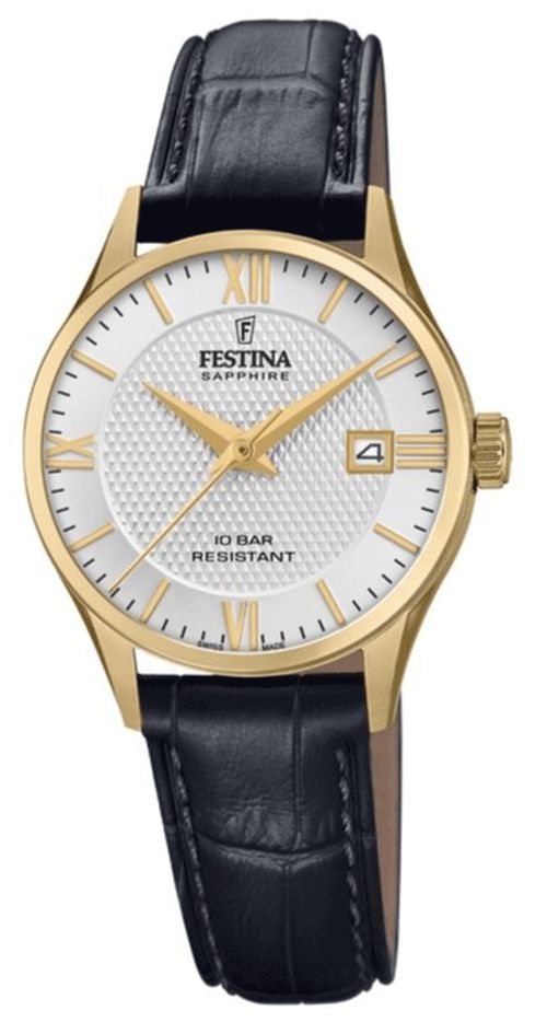 Značka: FESTINA | Kolekce: SWISS MADE | Model: 20011/1 | Barva: černá | Barva pouzdra: zlatá | Materiál pouzdra: ocel | Napájení: baterie | Materiál řemínku: kůže | Funkce: Datum - den v měsíci | Průměr: 29 mm | Vodotěsnost: 100M/10ATM | Sklo: safírové | Tvar: kulaté | Typ zapínání: standardní zapínání | Určení: dámské | Typ produktu: hodinky | Typ: ručičkové | Šířka řemínku: 14-12 mm
