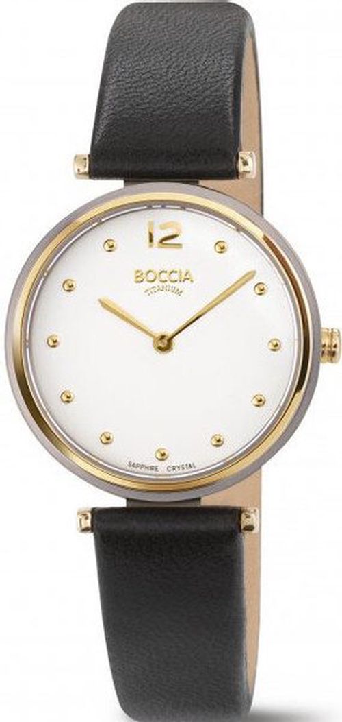 Dámské hodinky Boccia Titanium 3349-01 jsou určeny pro všechny možné příležitosti. Hodinky se hodí jak na denní nošení, tak i pro společenskou událost. Zaujmou především svým jednoduchým stylem, díky kterému jsou čitelné hned na první pohled. Model je vyveden v kombinaci titanového pouzdra a koženého řemínku. Pouzdro má PVD povrchovou úpravu ve zlaté barvě. Model hodinek Boccia Titanium 3349-01 je přesně tím, co na dámském zápěstí nesmí chybět. Titanové pouzdro ukrývá bateriový strojek s přesností ±15 s /…