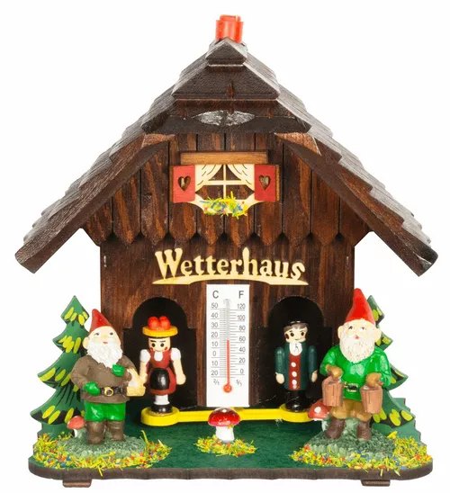 Barometr v podobě dřevěné pestrobarevné chaloupky. Bude-li hezky, z chaloupky vystoupí panenka. Bude-li ošklivé počasí, ukáže se panáček. Určeno do vnitřních prostor. Výrobce: Trenkle - Německo Materiál: dřevo